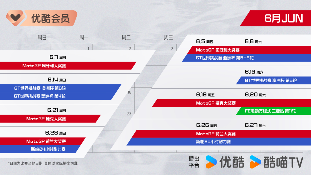 2026年,赛车盛宴轰鸣启幕! 优酷体育携三大赛事重磅来袭:3月20日,MotoGP巴西大奖赛;3月21日,FE电动方程式马德里站;3月28日,GT世界挑战赛澳洲杯第一轮。